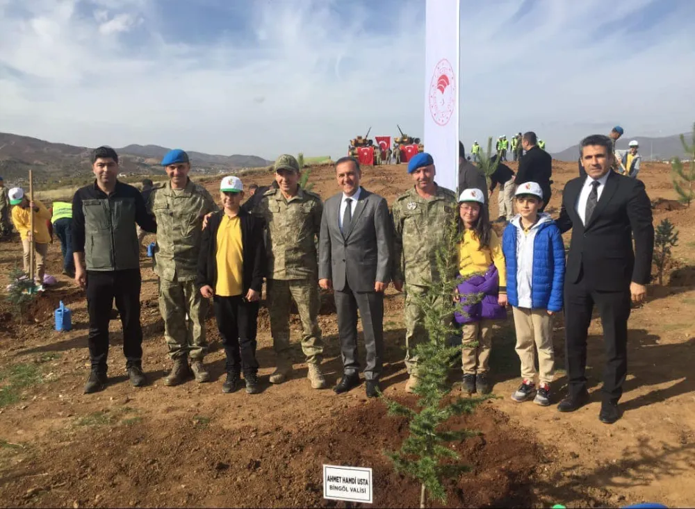 Milli Ağaçlandırma etkinlikleri kapsamında Bingöl’de 12.000 adet fidan toprakla buluşturuldu."Geleceğe Nefes Cumhuriyete Nefes" temasıyla gerçekleştirilen 11 Kasım Milli Ağaçlandırma Günü fidan dikim etkinliğine Bingöl Valisi Ahmet Hamdi Usta, Belediye Başkanı Erdal Arıkan, İl protokolü, sivil toplum kuruluşları, vatandaşlar ve ögrenciler katıldı. Bingöl Orman İşletme Müdürlüğü ve 49. Komando Tugay Komutanlığınca düzenlenen "Türkiye Yüzyılı Mehmetçik Hatıra Ormanı" fidan dikim etkinliğinde Vali Usta, Belediye Başkanımız Arıkan, askerler ve öğrencilerin katılımlarıyla 1510 adet fidan toprakla buluşturuldu.